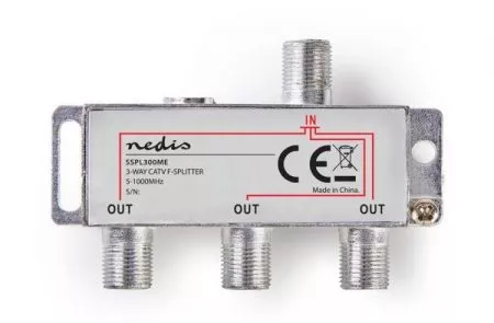 Splitter cu trei căi într-o carcasă turnată sub presiune de zinc cu conectori F pentru a împărți un semnal TV.