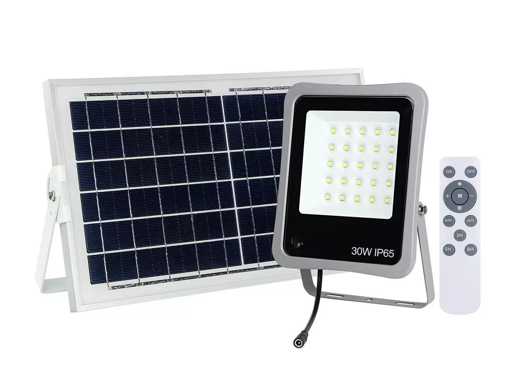 Proiectorul LED cu o putere de 30W beneficiaza de un panou solar cu ajutorul caruia se incarca, fiind o alegere ideala pentru a fi folosit in locurile fara surse de energie electrica: casa de vacanta, gradina, curte, cabana etc. sau pentru a economisi banii.