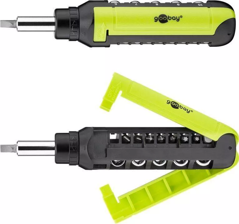 Set surubelnita cu clichet Goobay cu 8 biti si 5 tubulare.