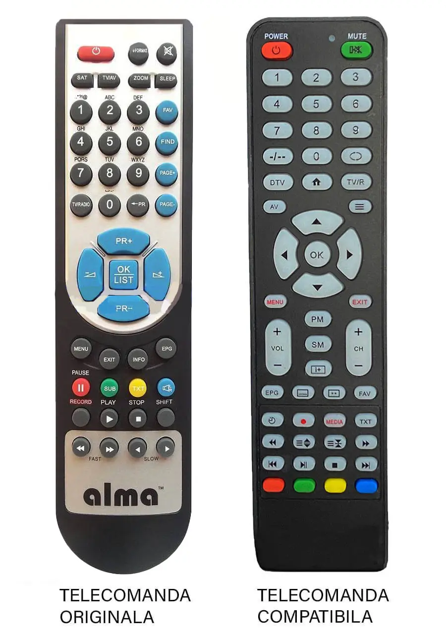 Telecomanda originala, afisata in stanga, este prezentata doar cu titlu de referinta, pentru a arata compatibilitatea.